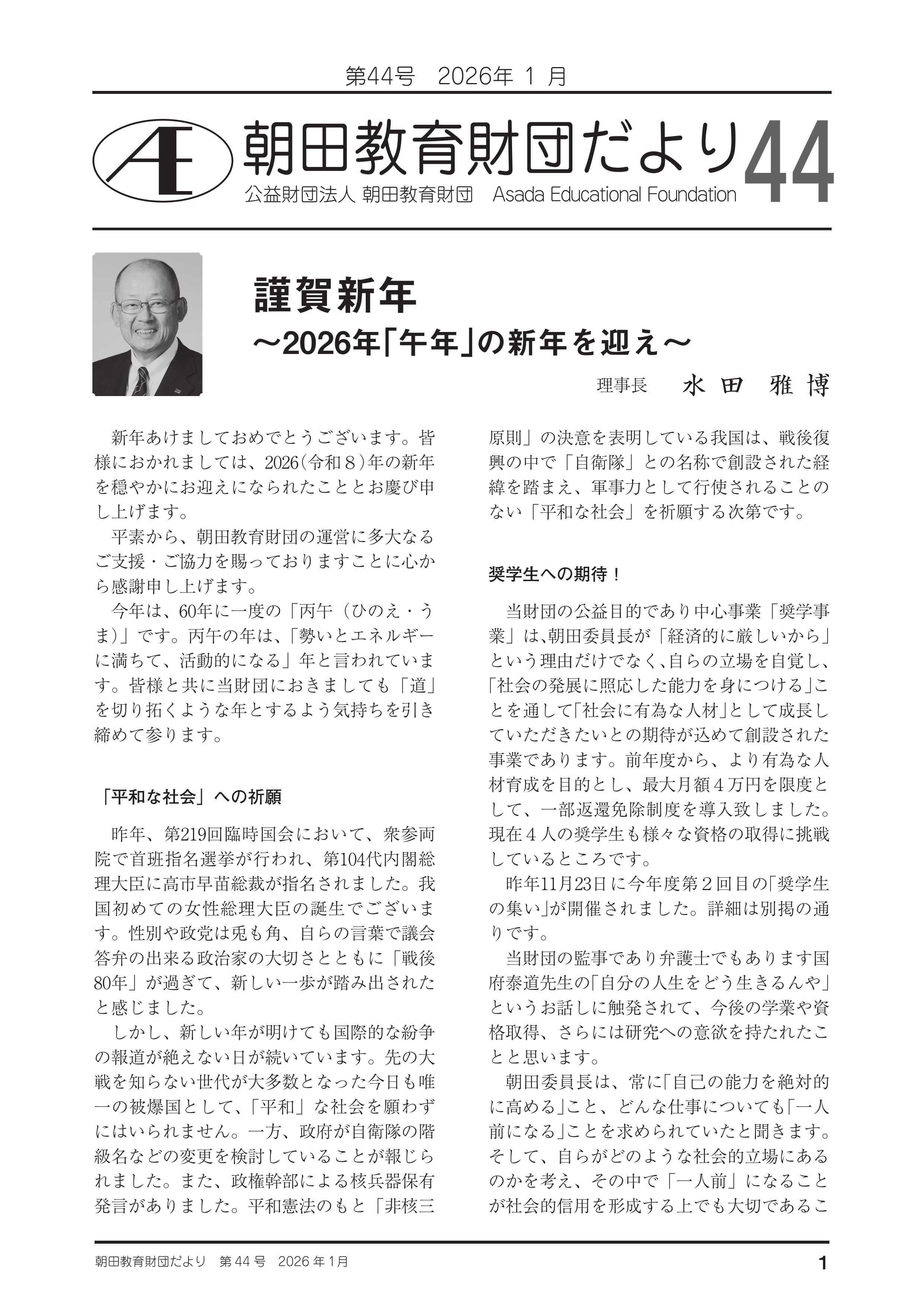 朝田教育財団だより44号(2026年冬季号)を発行しました。